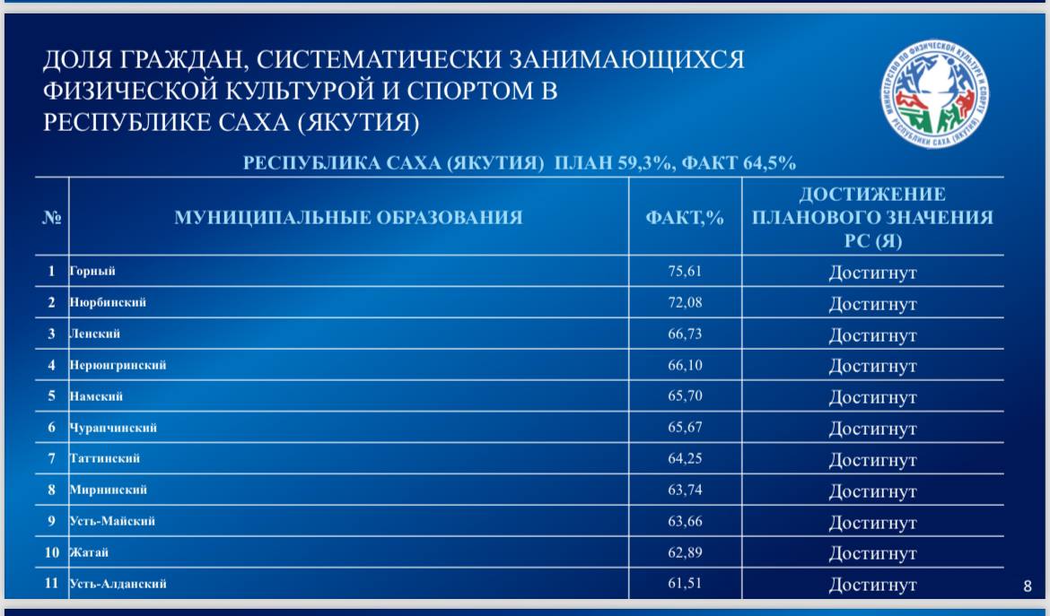 По доле систематически занимающихся физической культурой и спортом из 36 муниципальных районов и городских округов плановые значения выполнили 23 муниципалитета. В число территорий с устойчивым выполнением показателей входят Горный, Нюрбинский, Ленский, Нерюнгринский и Намский районы.
