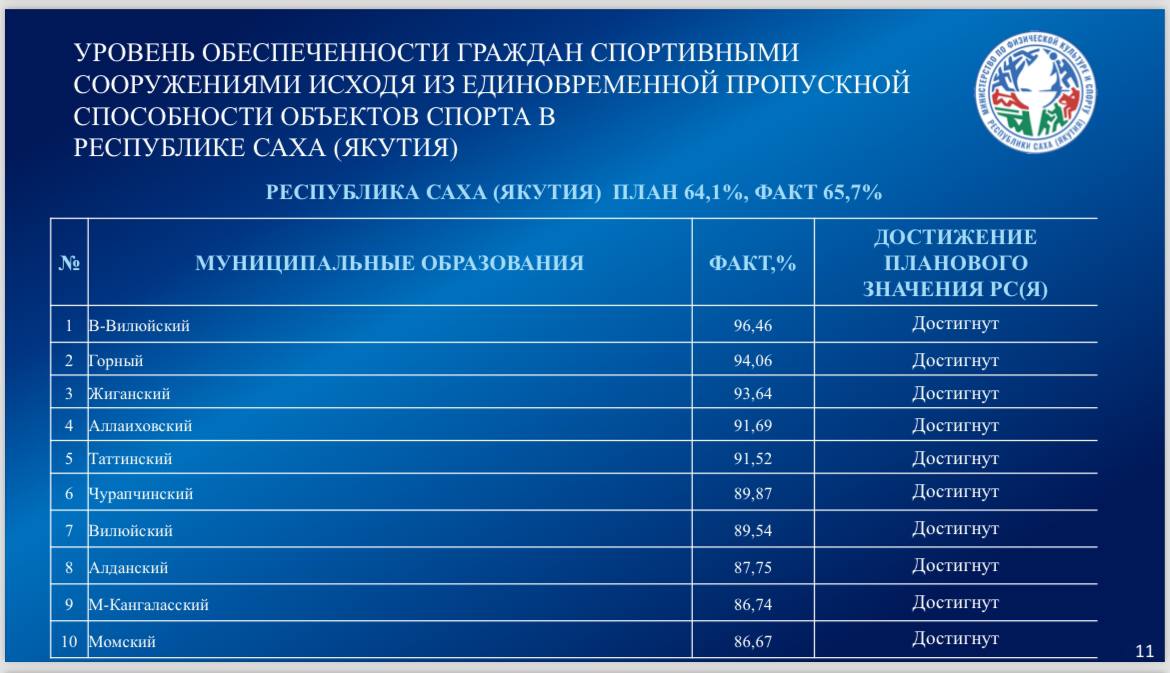 По уровню обеспеченности спортивной инфраструктурой к муниципалитетам с уверенным выполнением показателей относятся Верхневилюйский, Горный, Жиганский, Аллаиховский и Таттинский районы. Ниже среднереспубликанского уровня остаются девять районов, среди которых наиболее заметное отставание демонстрируют Анабарский, Усть-Янский, Булунский и Абыйский районы, а также город Якутск.