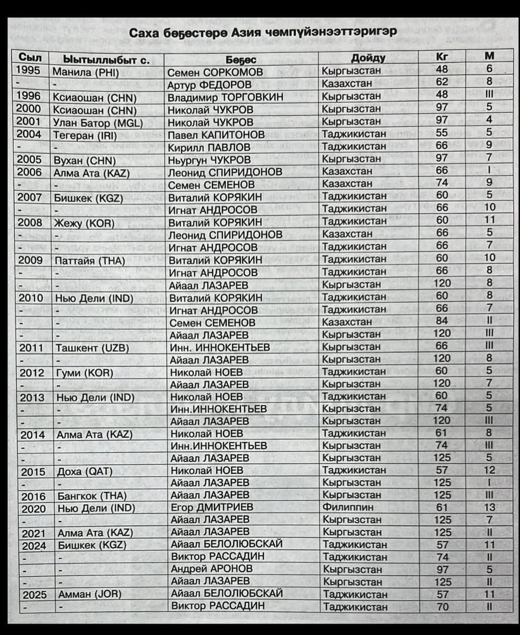 Чемпионами же становились Леонид Спиридонов в 2006 году в Алматы и Айаал Лазарев в 2015 году в Дохе. А Виктор Рассадин является двукратным финалистом последних чемпионатов Азии
