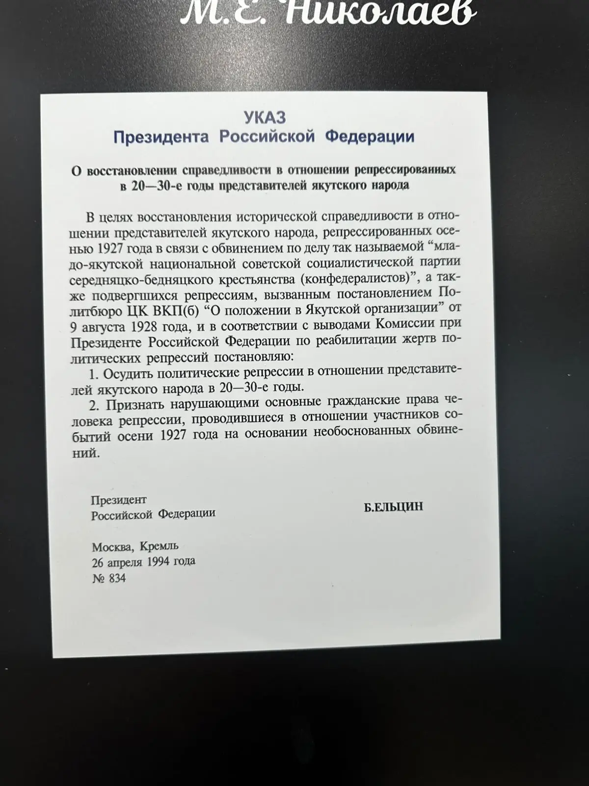 В этом контексте была отмечена и важная веха в восстановлении исторической справедливости: в 1994 году Президент Российской Федерации Борис Ельцин подписал Указ № 834, осудивший политические репрессии 1920–30-х годов в отношении представителей якутского народа и признавший их нарушающими основные гражданские права человека.
