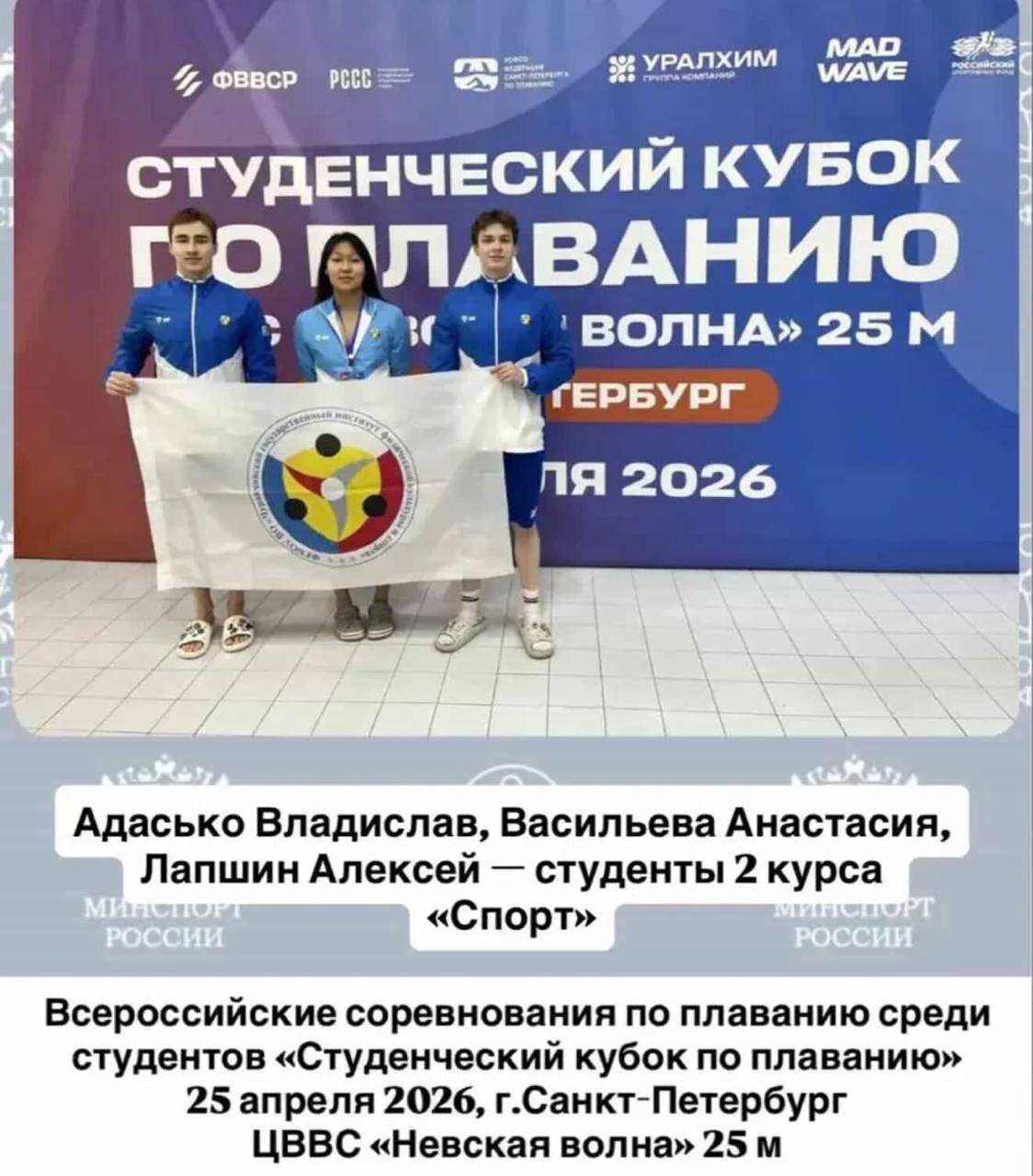 25 апреля в Санкт-Петербурге, в ЦВВС «Невская волна» (25 м), прошли Всероссийские соревнования по плаванию среди студентов — «Студенческий кубок по плаванию», где принимало 298 участников.